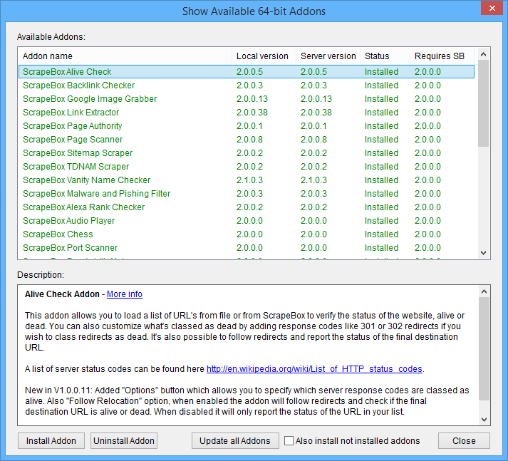 The addons can be downloaded in ScrapeBox by clicking the “Addons” menu which will bring up the window below containing the list of available addons and their versions. Then simply select the addon and click Install and it will be added to ScrapeBox. Also at the bottom of this page are 3 stand-alone tools marked (Free) and these are available for everyone, even if you do not own ScrapeBox.