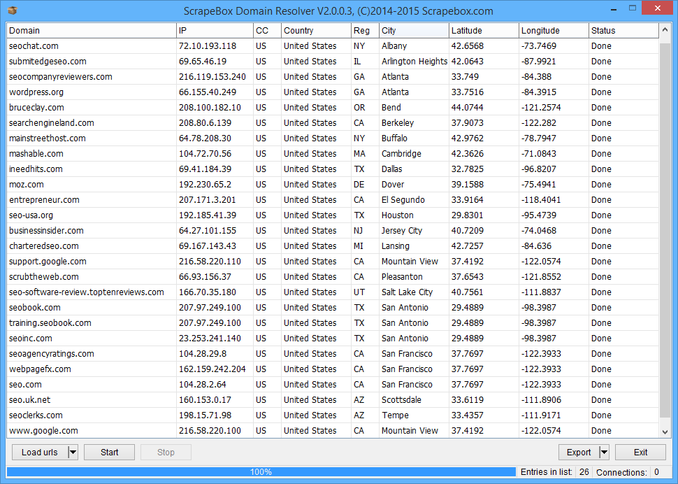 With the Bulk Domain Resolver you can resolve the IP, Country, City and co-ordinates of domains.