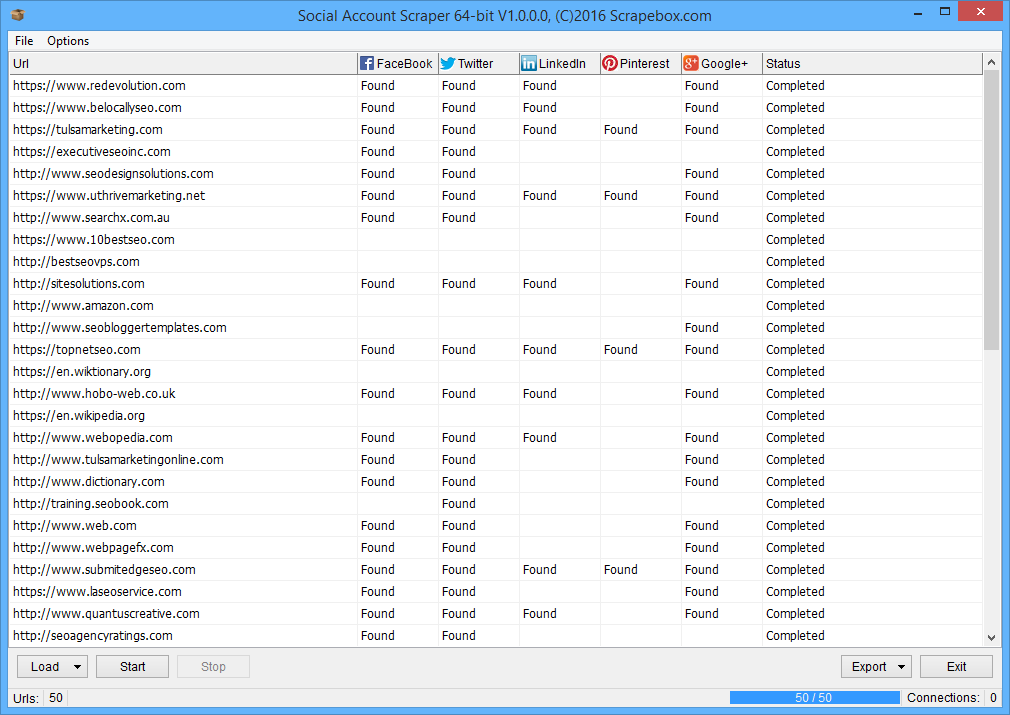 Mass scan websites and extract social media profile links from FaceBook, Twitter, Pinterest, LinkedIn and Google+