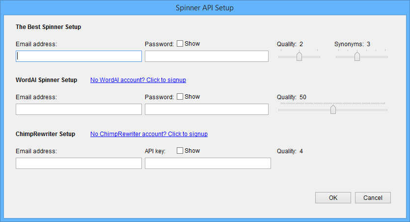 If you need to rewrite articles fast, and don’t wish to use the free built-in spinner and synonym database you can make use of The Best Spinner API, WordAI or ChimpRewriter accounts to rewrite multiple articles at once converting them in to “Spintax” versions.