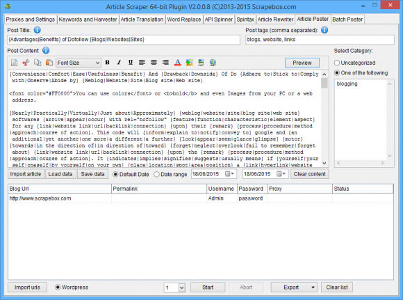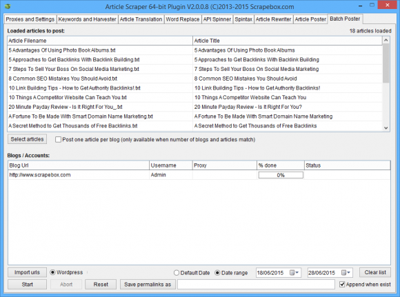 What’s a whole bunch of unique content if you can’t submit it to your sites? The Article Scraper Plugin contains a blog poster, which allows you to post your articles to your WordPress blogs!