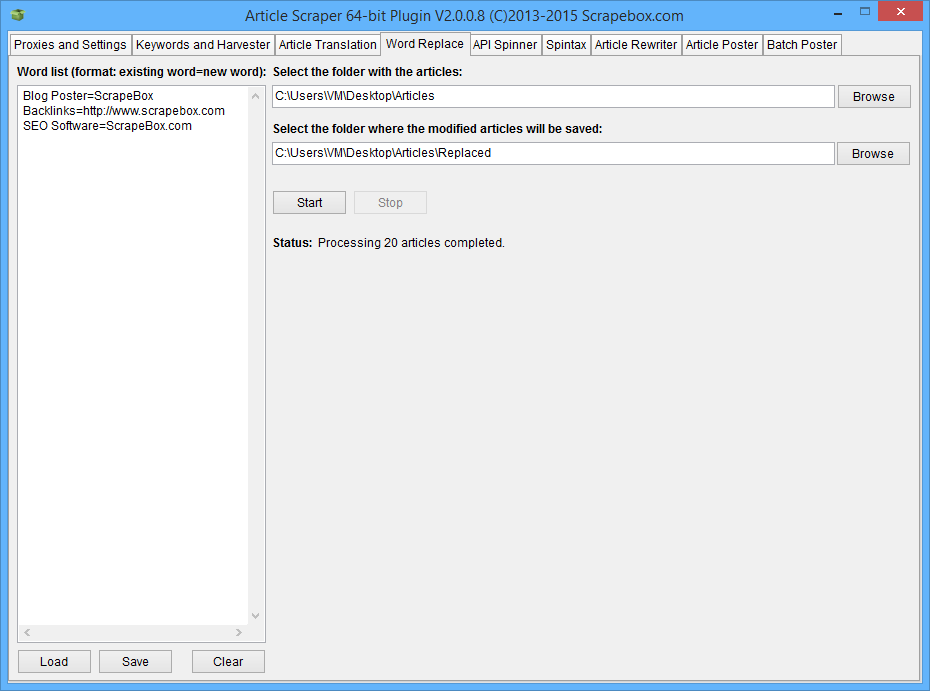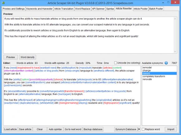 The ScrapeBox Article Scraper Plugin contains an article re-writer with it’s own internal synonym replacement database, this allows you to rewrite articles without typing any typing by simply clicking the words. The synonym database is editable allowing you to add and delete synonyms so you can grow the database and customize it to suite your own writing style or be relevant to your niche or language.