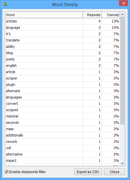 Also at a glance you can see stats such as your article word count, number of words in spintax and your spintax density to easily see during rewriting if your article is “spun enough” and unique. Also just added is a keyword density checker, so you can easily check the keyword densities of your articles both with and without stopwords before saving your articles and even save the keywords and densities to a .csv file.