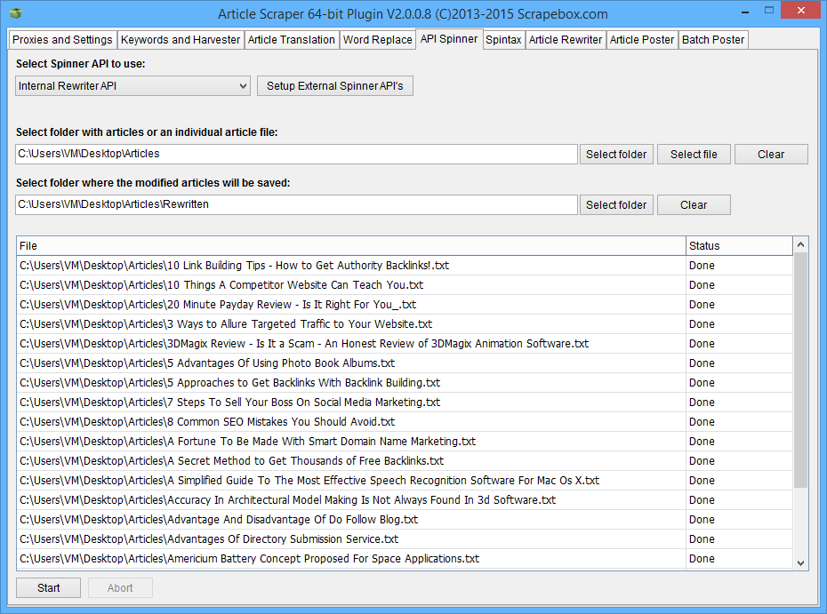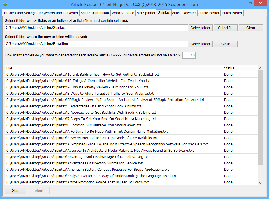 After spinning, rewriting or translating your articles you can load an entire folder full of articles which can contain spintax and submit them to your blog.