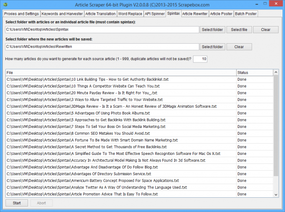 This feature couldn’t get much simpler, just select an article or folder full of articles in “spintax” format and select how many versions of each article you would like.