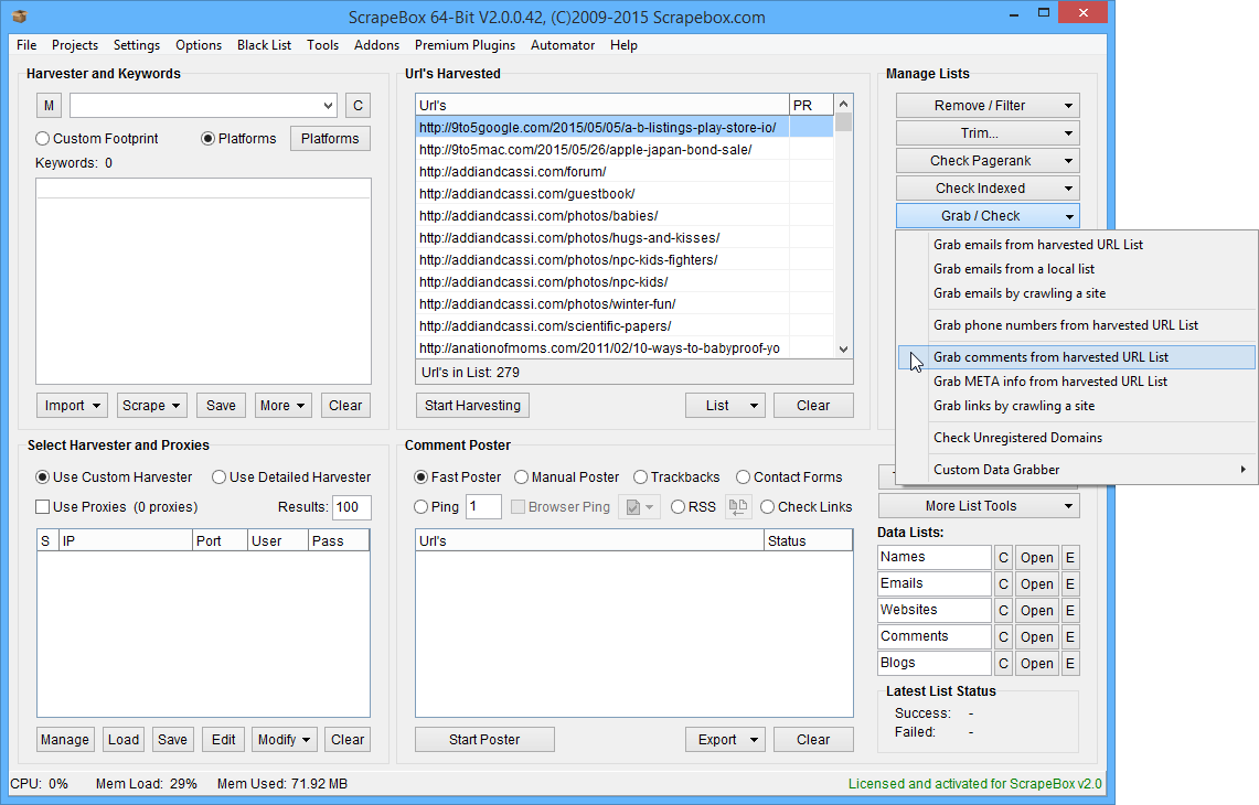 Built-in to the ScrapeBox Harvesters “Manage Lists” section means using and accessing the Comment Scraper is simple.