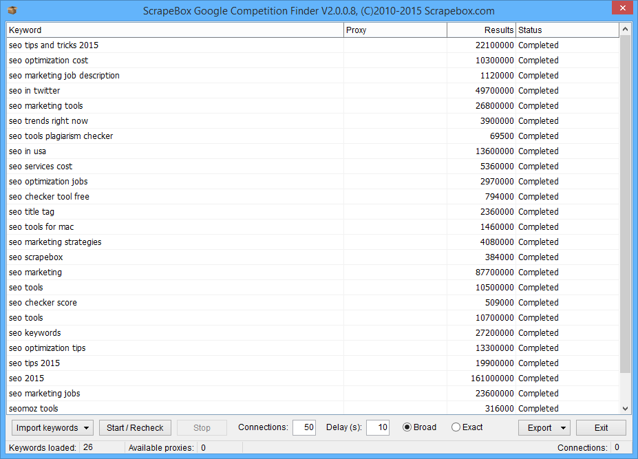 Once installed you can load a list of keywords from a text file, or from the ScrapeBox keyword scraper. You can also select Broad or Exact match which checks the keywords in quotes. This addon is multi-threaded, and can check the Google competition for 100’s of keywords per minute. It also features randomly rotating proxy support. Once the results are fetched, you can export the data to a .CSV file or to a plain text file for use in ScrapeBox, other software for further research.