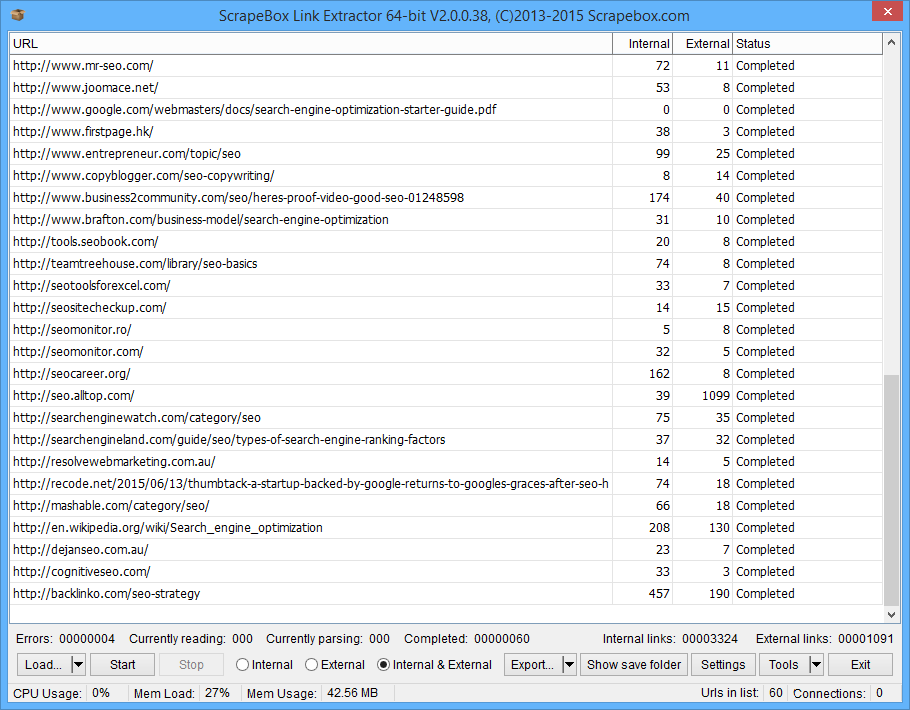 Once installed, you can load a list of domains harvested from ScrapeBox or load domains from a file, you can set how many concurrent threads you wish to use. The addon is multi-threaded and can retrieve the Internal and External links for 100’s of domains per minute. Once the results are fetched, you can export the data to a plain text file for use in ScrapeBox, other software.