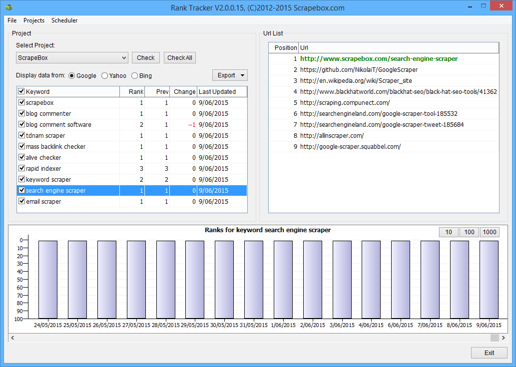 The ScrapeBox RankTracker plugin allows you to track where your website or web pages rank for an unlimited number of keywords on the three main search engines Google, Yahoo and Bing.