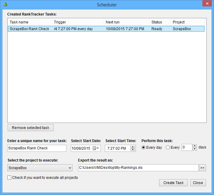 With RankTracker now you can schedule your projects to run automatically even when ScrapeBox or the RankTracker is shut down.