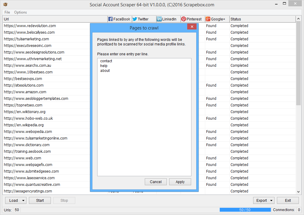 It also has the ability to crawl internal URL’s based on keywords to hunt of published social media profiles. Some sites may only list their social media profile links on an internal page such as the “Contact Us” page, “About Us” or the “Help” pages for example. That’s no problem, the addon allows you to add a list of keywords and when it crawls the URL you have loaded if it doesn’t find any social media profile urls it will then look for internal links using your keywords, and load each of those scanning for profile links. This means it’s fully customizable, and you can even add keywords in other languages.
