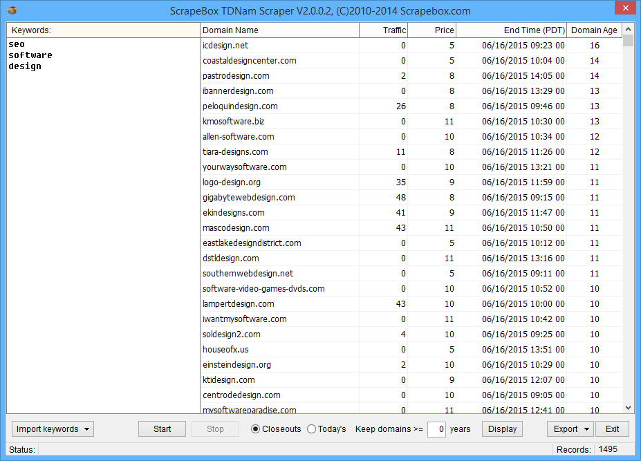 Once installed, you can simply type a keyword, select if you want to check the closeouts or regular auctions and click Start. The addon will fetch all matching TDNAM domains in all extensions such as .com, .net, .org etc. You can sort the results by domain age, or domain traffic or auction end time. If you are looking for aged domains, you can enter an age in years and display only those domains older then the age you specified.
