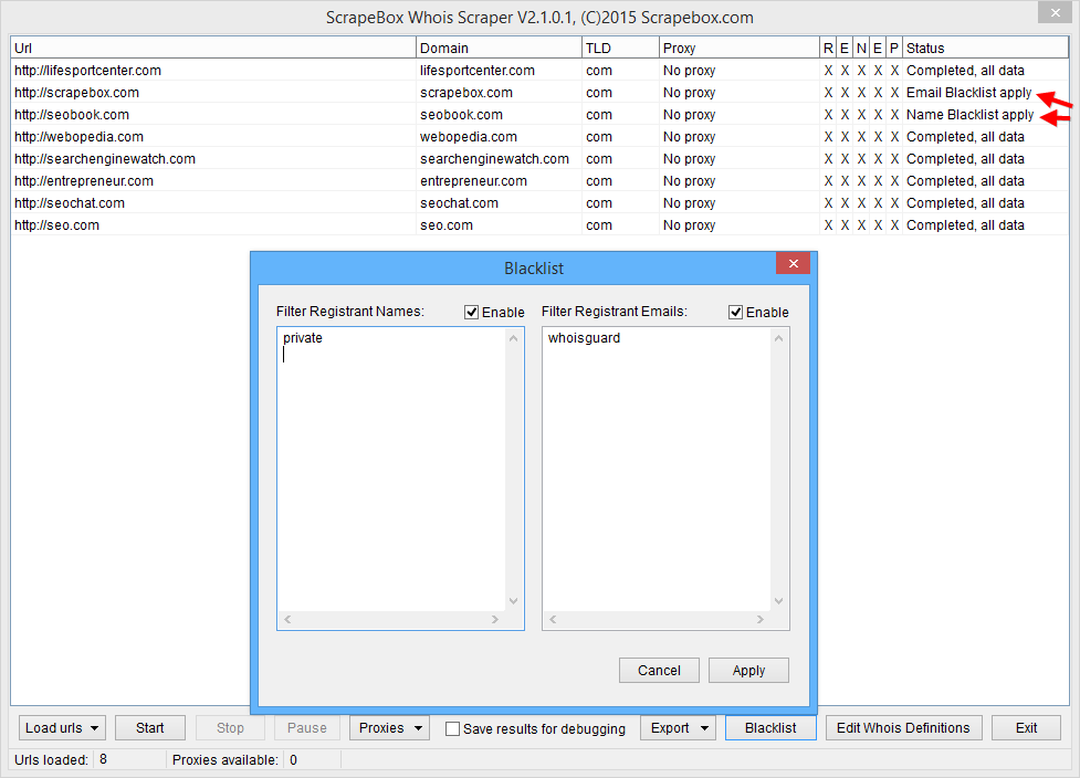 We have also recently added a Blacklist Feature, allowing you to independently filter results based on words contained within the registrants Name or Email. So now you are able to add keywords to filter out things like domains with whois guard or privacy protection, or even domains owned by competitors or large companies you do not wish to contact.