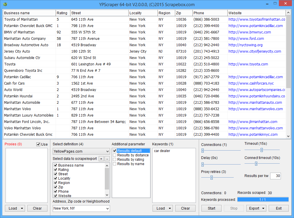 The Yellow Pages Scraper allows you to search by city or zip code, and search by a number of different criteria such as searching businesses by distance, rating or by name. There’s the option to use proxies, or to search with a delay to emulate human behavior.